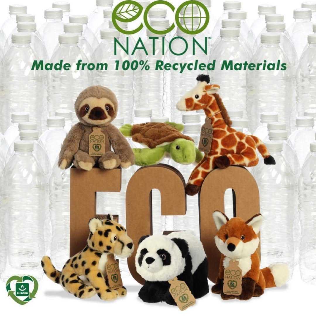 Ooit was ik een plastic fles! Deze Eco knuffellijn is geheel gemaakt van gerecycled materiaal, elke knuffel wordt gemaakt van zo'n 6 halve liter petflesjes. De petflessen worden vermalen tot pellets (korrels), waarna de pellets worden gesmolten en verwerkt tot garen. De garens worden gebruikt voor de knuffel productie. De knuffels hebben geen kraalogen maar geborduurde ogen. Het is ongelooflijk dat de knuffels toch zo zacht zijn, een prachtige kwaliteit. De volledige knuffel; de buitenkant, de vulling, de kartonnen labels, zijn gemaakt van gerecycled materiaal en natuurlijke materialen. Deze Eco Nation lijn draagt daarmee optimaal bij aan een groenere planeet!